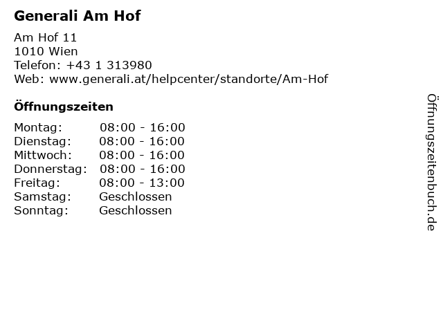 | Öffnungszeiten Generali Am Hof in Wien anzeigen | |