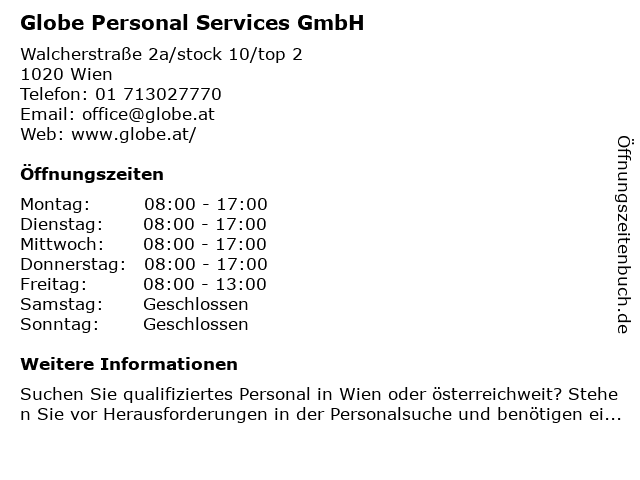 | Öffnungszeiten Globe Personal Services GmbH in Wien anzeigen | |