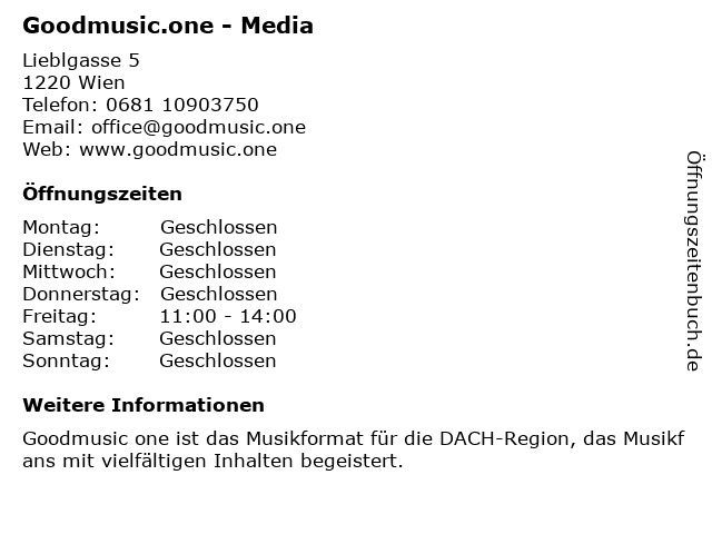 | Öffnungszeiten Goodmusic.one - Media in Wien anzeigen | |