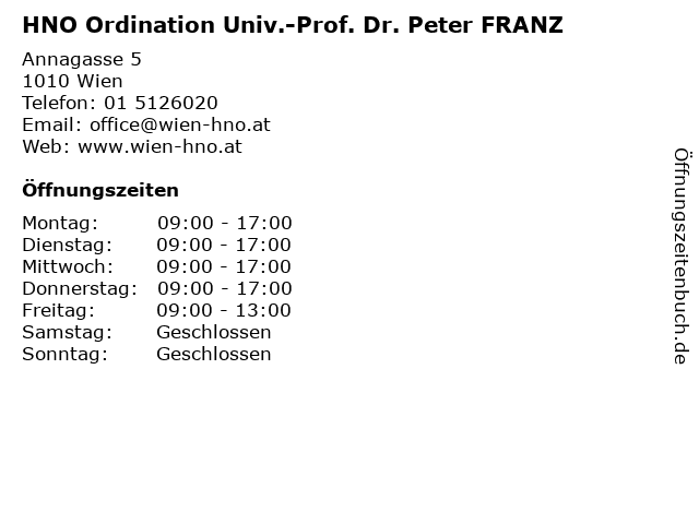 Branchen & Suchbegriffe zu HNO Ordination Univ.-Prof. Dr. Peter FRANZ:dr., franz, hno, ordination, peter, prof., univ. |