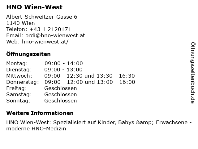 | Öffnungszeiten HNO Wien-West in Wien anzeigen | |