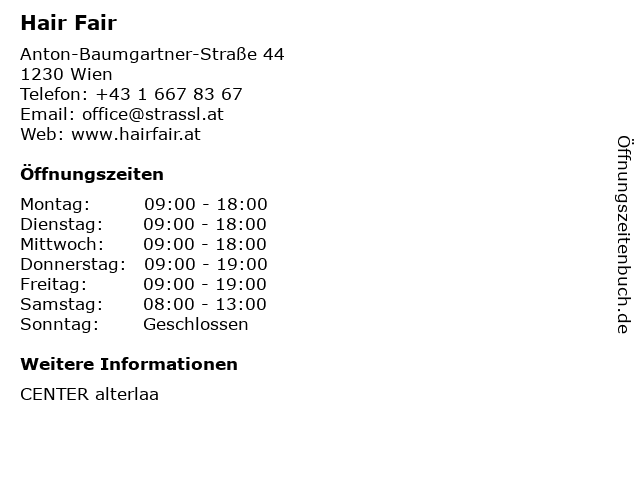 | Öffnungszeiten Hair Fair in Wien anzeigen | |