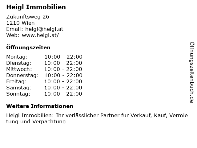 | Öffnungszeiten Heigl Immobilien in Wien anzeigen | |