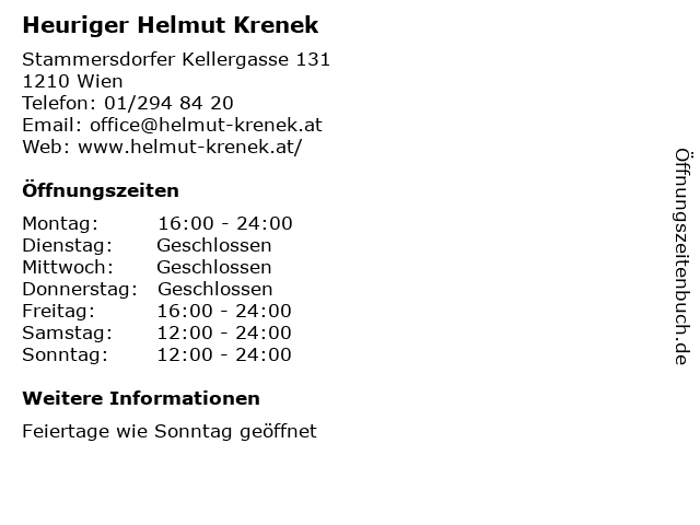 | Öffnungszeiten Heuriger Helmut Krenek in Wien anzeigen | |