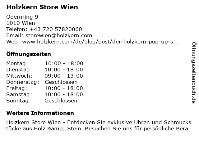 | Öffnungszeiten Holzkern Store Wien in Wien anzeigen | |