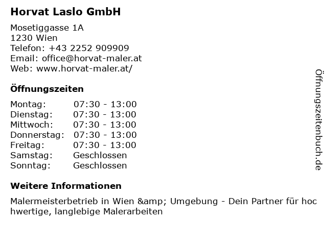 | Öffnungszeiten Horvat Laslo GmbH in Wien anzeigen | |