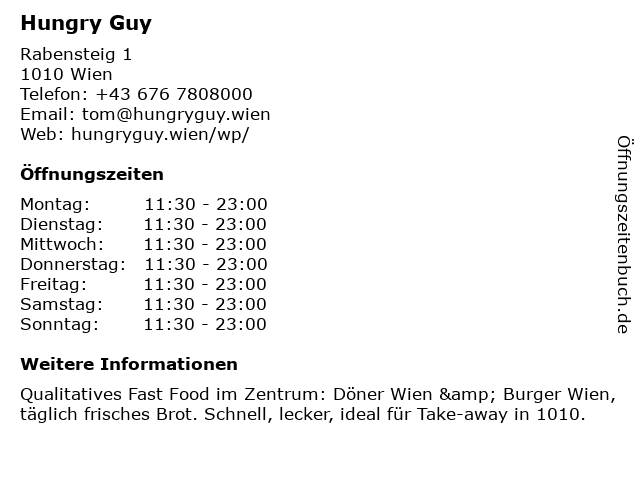 | Öffnungszeiten Hungry Guy in Wien anzeigen | |