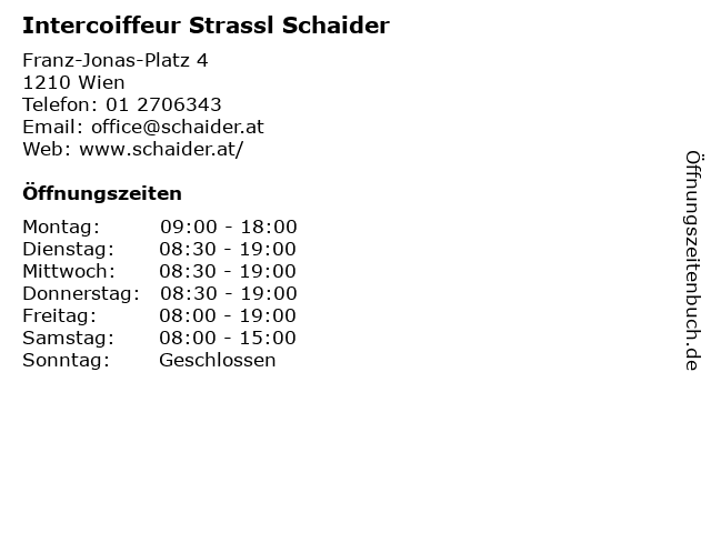 | Öffnungszeiten Intercoiffeur Strassl Schaider in Wien anzeigen | |