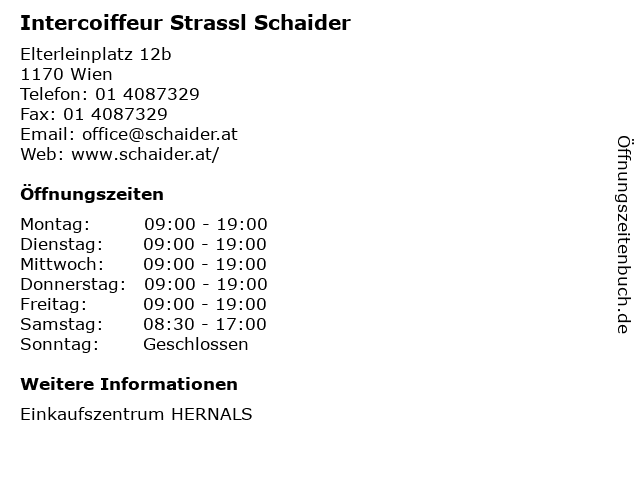 | Öffnungszeiten Intercoiffeur Strassl Schaider in Wien anzeigen | |