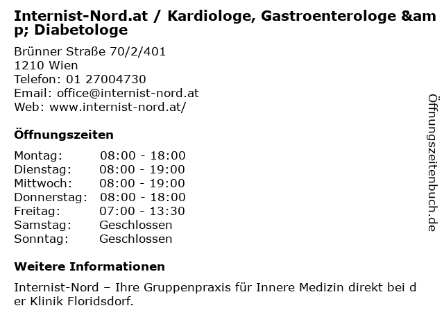 1 Gruppenpraxis Internist-Nord.at FÄ für Innere Medizin, Kardiologie, Gastroenterologie & Diabetologie (Entfernung: 0,00 km) Brünner Straße 70 stiege 2/401, 1210 Wien 3 BESTATTUNG WIEN - Kundenservice Floridsdorf Nord (Entfernung: 0,06 km) Brünner Straße 70 stiege 2/top 1, 1210 Wien 5 6 |