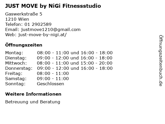 | Öffnungszeiten JUST MOVE by NiGi Fitnessstudio in Wien anzeigen | |
