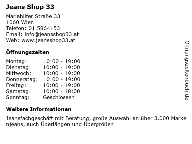 | Öffnungszeiten Jeans Shop 33 in Wien anzeigen | |