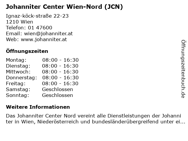 | Öffnungszeiten Johanniter Center Wien-Nord (JCN) in Wien anzeigen | |