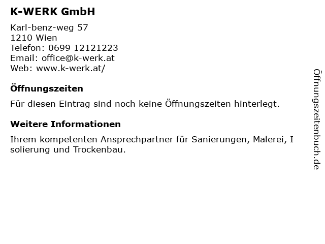 | Öffnungszeiten K-WERK GmbH in Wien anzeigen | |