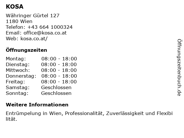 | Öffnungszeiten KOSA in Wien anzeigen | |