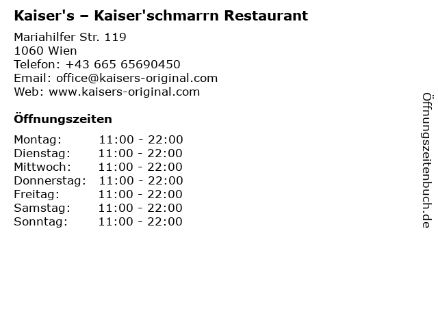 Öffnungszeiten Kaiser's – Kaiser'schmarrn Restaurant in Wien anzeigen