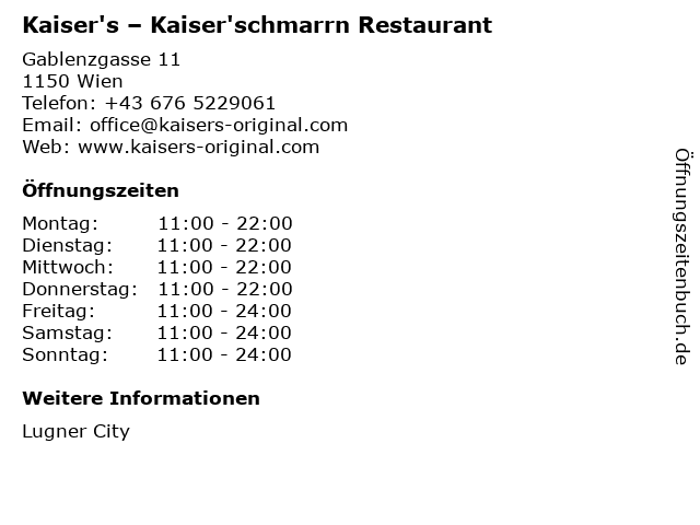 Öffnungszeiten Kaiser's – Kaiser'schmarrn Restaurant in Wien anzeigen