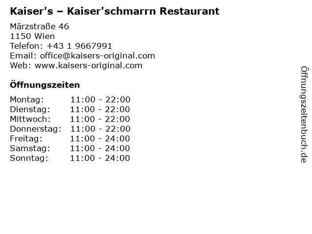 Öffnungszeiten Kaiser's – Kaiser'schmarrn Restaurant in Wien anzeigen