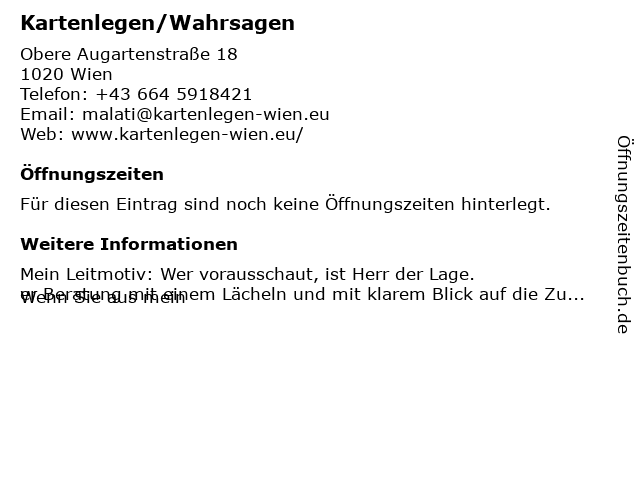 | Öffnungszeiten Kartenlegen/Wahrsagen in Wien anzeigen | |