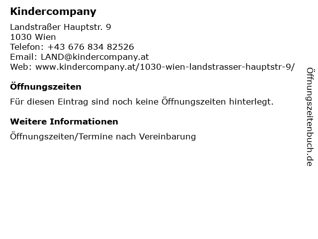 | Öffnungszeiten Kindercompany in Wien anzeigen | |