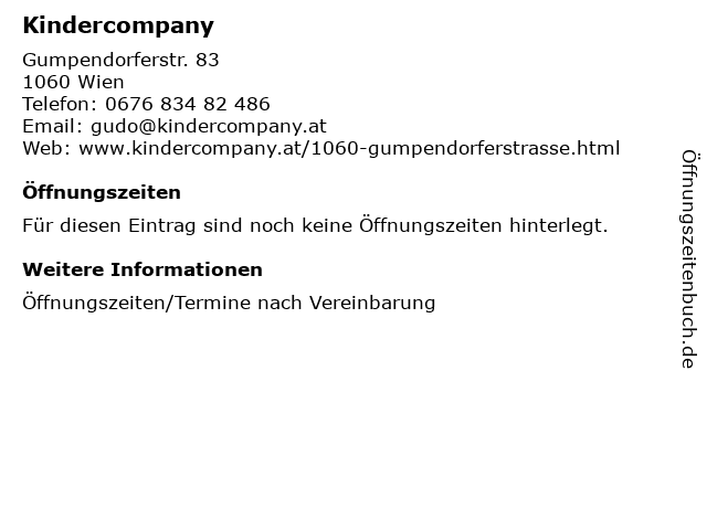 | Öffnungszeiten Kindercompany in Wien anzeigen | |