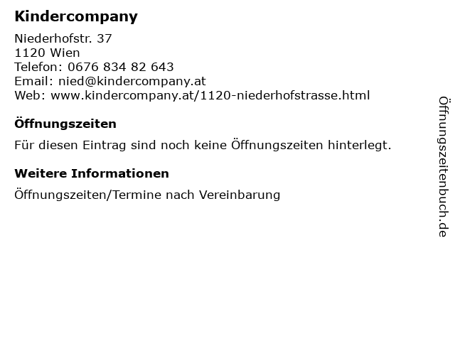 | Öffnungszeiten Kindercompany in Wien anzeigen | |