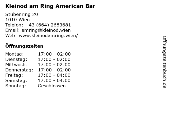 | Öffnungszeiten Kleinod am Ring American Bar in Wien anzeigen | |