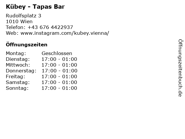 | Öffnungszeiten Kübey - Tapas Bar in Wien anzeigen | |