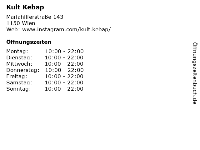 | Öffnungszeiten Kult Kebap in Wien anzeigen | |