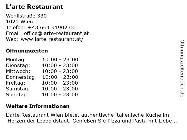 | Öffnungszeiten L'arte Restaurant in Wien anzeigen | |