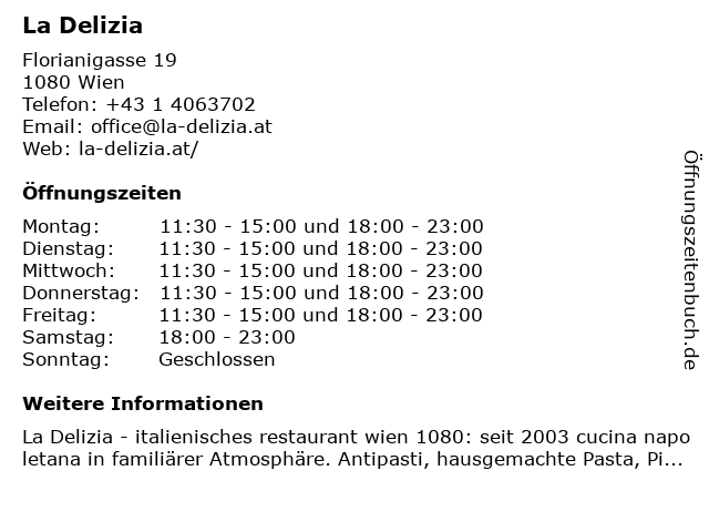 | Öffnungszeiten La Delizia in Wien anzeigen | |