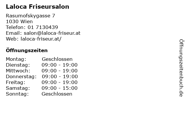 | Öffnungszeiten Laloca Friseursalon in Wien anzeigen | |