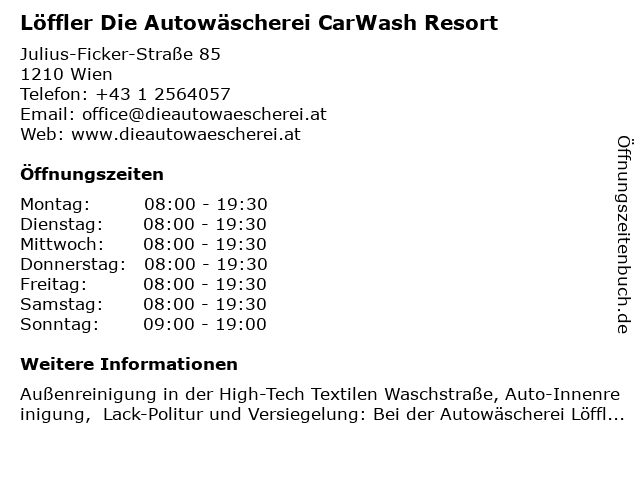 2 Löffler - Die Autowäscherei (Waschstraße 01.03. - 30.11.) (Entfernung: 0,03 km) Julius-Ficker-Straße 85, 1210 Wien 5 Sparkasse Korneuburg AG - (Bankomat G3 Shopping Resort Gerasdorf) (Entfernung: 8,55 km) G3 Platz 1, 2201 Gerasdorf bei Wien 6 |
