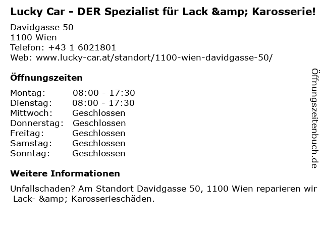1 Lucky Car - DER Spezialist für Lack & Karosserie! (Entfernung: 3,99 km) Untere Viaduktgasse 6, 1030 Wien 2 Lucky Car - DER Spezialist für Lack & Karosserie! (Entfernung: 4,14 km) Breitenfurter Straße 143, 1120 Wien 3 Lucky Car - DER Spezialist für Lack & Karosserie! (Entfernung: 5,18 km) Hernalser Hauptstraße 23, 1170 Wien 4 Lucky Car - DER Spezialist für Lack & Karosserie! (Entfernung: 5,75 km) Konsumstraße 23, 2331 Vösendorf 5 Lucky Car - DER Spezialist für Lack & Karosserie! (Entfernung: 7,08 km) Heiligenstädter Lände 11, 1190 Wien 6 Lucky Car - DER Spezialist für Lack & Karosserie! (Entfernung: 10,02 km) Hirschstettner Straße 44, 1220 Wien |