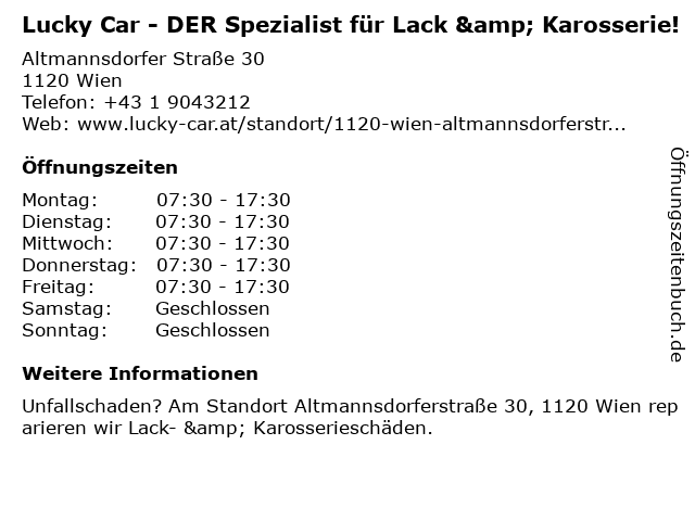 1 Lucky Car - DER Spezialist für Lack & Karosserie! (Entfernung: 0,90 km) Breitenfurter Straße 143, 1120 Wien 3 Lucky Car - DER Spezialist für Lack & Karosserie! (Entfernung: 4,59 km) Konsumstraße 23, 2331 Vösendorf 4 Lucky Car - DER Spezialist für Lack & Karosserie! (Entfernung: 5,46 km) Hernalser Hauptstraße 23, 1170 Wien 5 Lucky Car - DER Spezialist für Lack & Karosserie! (Entfernung: 6,74 km) Untere Viaduktgasse 6, 1030 Wien 6 |