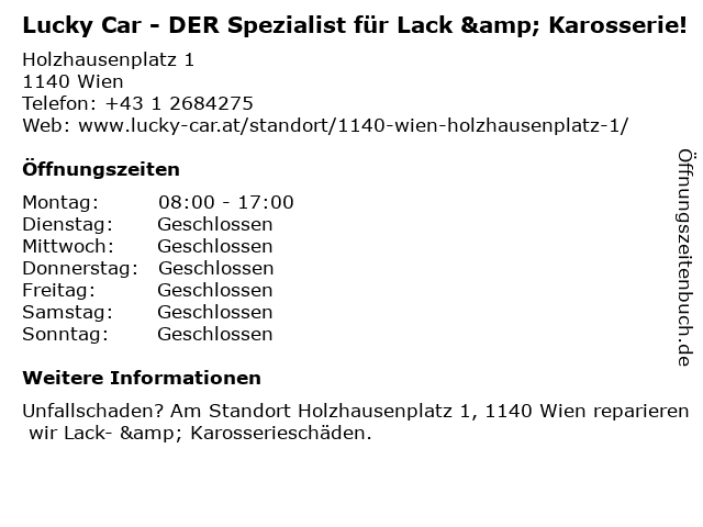 1 Lucky Car - DER Spezialist für Lack & Karosserie! (Entfernung: 7,76 km) Altmannsdorfer Straße 30, 1120 Wien 2 Lucky Car - DER Spezialist für Lack & Karosserie! (Entfernung: 8,14 km) Breitenfurter Straße 143, 1120 Wien 3 Lucky Car - DER Spezialist für Lack & Karosserie! (Entfernung: 8,56 km) Hernalser Hauptstraße 23, 1170 Wien 4 Lucky Car - DER Spezialist für Lack & Karosserie! (Entfernung: 10,77 km) Heiligenstädter Lände 11, 1190 Wien 6 Lucky Car - DER Spezialist für Lack & Karosserie! (Entfernung: 11,30 km) Konsumstraße 23, 2331 Vösendorf |