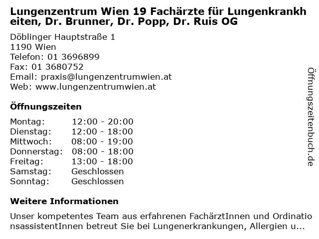 Branchen & Suchbegriffe zu Lungenzentrum Wien 19 Fachärzte für Lungenkrankheiten, Dr. Brunner, Dr. Popp, Dr. Ruis OG:19, brunner, dr., fachärzte, lungenkrankheiten, lungenzentrum, og, popp, ruis, wien |