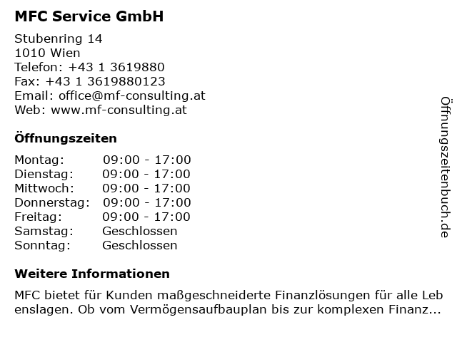 | Öffnungszeiten MFC Service GmbH in Wien anzeigen | |