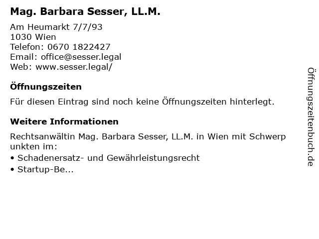 | Öffnungszeiten Mag. Barbara Sesser, LL.M. in Wien anzeigen | |