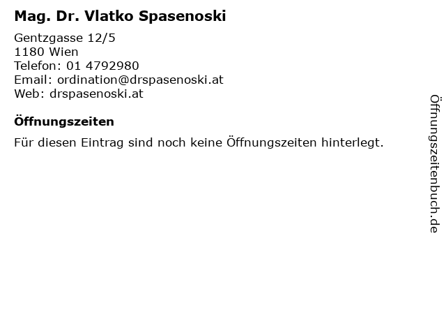 | Öffnungszeiten Mag. Dr. Vlatko Spasenoski in Wien anzeigen | |
