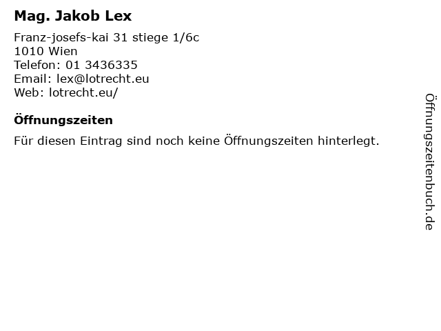 | Öffnungszeiten Mag. Jakob Lex in Wien anzeigen | |