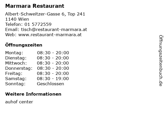 | Öffnungszeiten Marmara Restaurant in Wien anzeigen | |