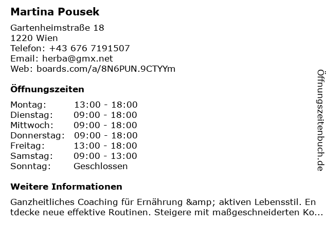| Öffnungszeiten Martina Pousek in Wien anzeigen | |