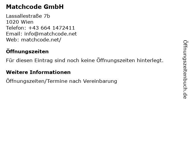 | Öffnungszeiten Matchcode GmbH in Wien anzeigen | |