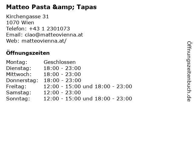 | Öffnungszeiten Matteo Pasta & Tapas in Wien anzeigen | |