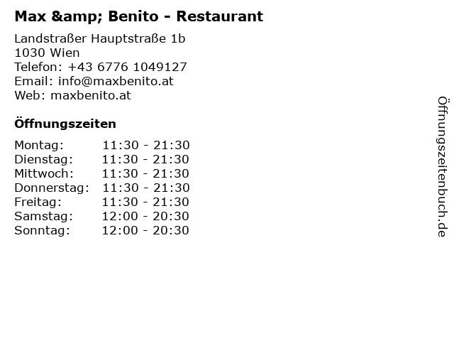 | Öffnungszeiten Max & Benito - Restaurant in Wien anzeigen | |