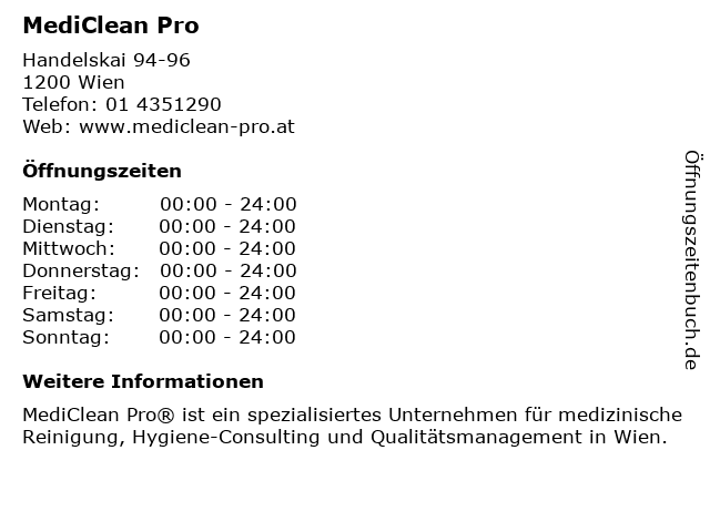 | Öffnungszeiten MediClean Pro in Wien anzeigen | |