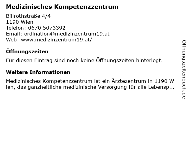 | Öffnungszeiten Medizinisches Kompetenzzentrum in Wien anzeigen | |