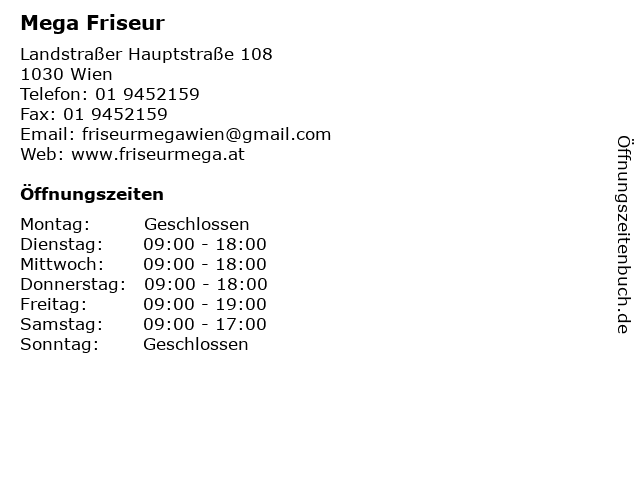| Öffnungszeiten Mega Friseur in Wien anzeigen | |