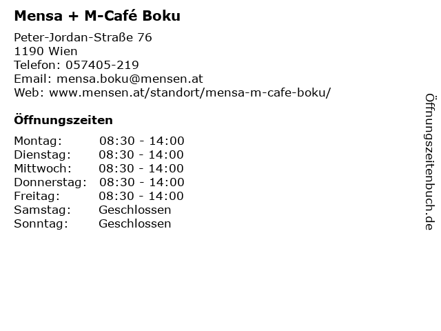 | Öffnungszeiten Mensa + M-Café Boku in Wien anzeigen | |